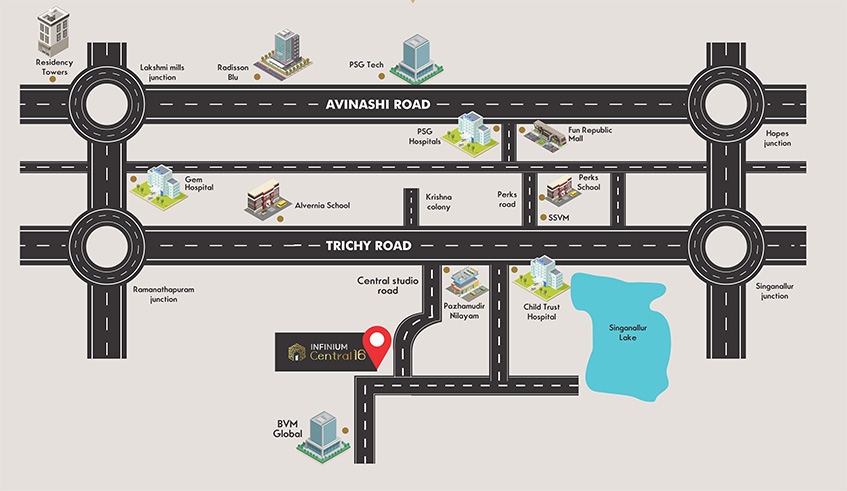 Located 2 mins off Trichy Road, within 5 mins drive from Singanallur Junction, Ramanathapuram Junction & 10 mins to Race Course